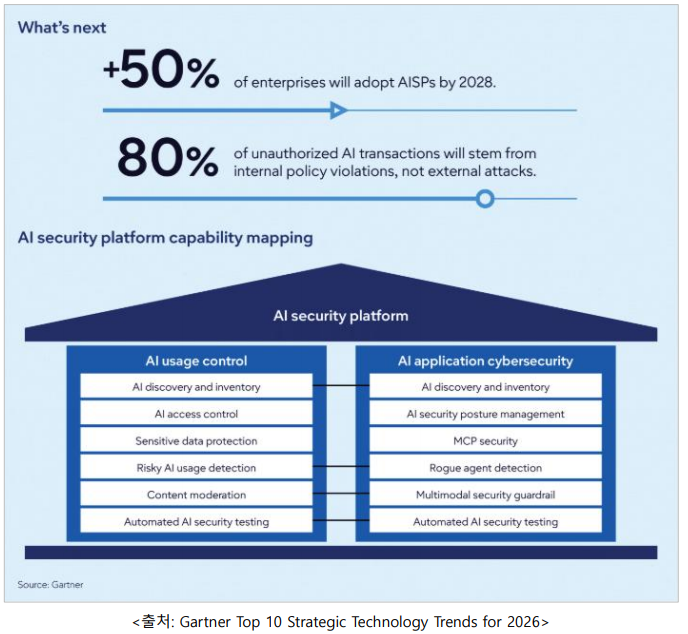 - AI 보안 플랫폼은 외부 AI 서비스와 기업 내부에서 개발한 맞춤형 AI 애플리케이션을 모두 보호하기